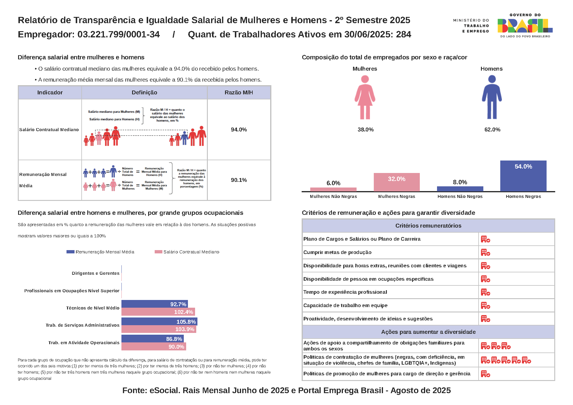 A igualdade salarial entre homens e mulheres é um aspecto crucial da transparência empresarial. No Brasil, apesar dos avanços legislativos e das iniciativas para promover a igualdade de gênero, ainda há uma discrepância significativa nos salários. De acordo com o 1º Relatório Nacional de Transparência Salarial, as mulheres ganham, em média, 19,4% menos do que os homens. A diferença é ainda mais acentuada em cargos de gerência ou direção, onde a disparidade chega a 25,2%. Além disso, o relatório destaca que as mulheres negras enfrentam uma desigualdade ainda maior, ganhando apenas 68% da remuneração média, enquanto os homens não negros recebem 27,9% acima da média. Apenas 32,6% das empresas possuem políticas de incentivo à contratação de mulheres, o que indica a necessidade de um esforço maior para alcançar a igualdade salarial plena. A transparência em relação à igualdade salarial não só promove um ambiente de trabalho mais justo, mas também reforça o compromisso da empresa com a ética e a responsabilidade social. Isso pode ser alcançado por meio de políticas claras de remuneração, auditorias regulares dos salários e promoção de práticas inclusivas que garantam oportunidades iguais para todos. Lutando contra essa desigualdade, divulgamos o relatório da diferença e média salarial entre homens e mulheres na nossa empresa.